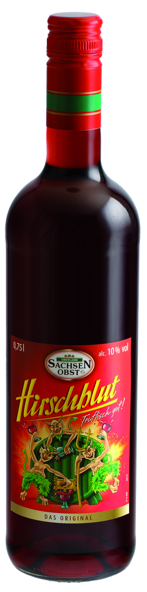 Hirschblut - Das Original aus Sachsen kaufen, der Mehrfruchtwein der teuflich gut schmeckt. Vollmundig, traditionell aus sächsischen, heimischen Rohstoffen hergestellt. Ein Kultgetränk, eine Spezialität aus Sachsen. Schon 1950 vom damaligen Eigentümer der Kelterei Heinrich Hirschberger kreiert. Hirschblut der heuigen Sachsenobst Kelterei wird nach dem ursprünglichen Rezept hergestellt und gut genkühlt genossen. Auch als Schorle sehr beliebt, Mehrfruchtwein vom Feinsten. Teuflich gut.